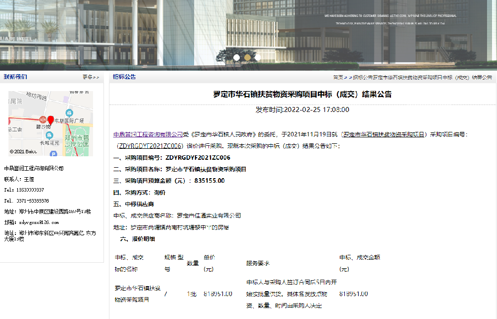 鼎點(diǎn)娛樂(lè)工程咨詢(xún)有限公司受《羅定市華石鎮(zhèn)人民政府》的委托,于2021年11月19日就(羅定市華石鎮(zhèn)扶貧物資采購(gòu)項(xiàng)目)采購(gòu)項(xiàng)目編號(hào):(ZDYRGDYF2021ZC006)詢(xún)價(jià)進(jìn)行采購(gòu),F(xiàn)就本次采購(gòu)的中標(biāo)(成交)結(jié)果公告如下:一、采購(gòu)項(xiàng)目編號(hào):ZDYRGDYF2021ZC006二、采購(gòu)項(xiàng)目名稱(chēng):羅定市華石鎮(zhèn)扶貧物資采購(gòu)項(xiàng)目三、采購(gòu)項(xiàng)目預(yù)算金額([詳細(xì)]